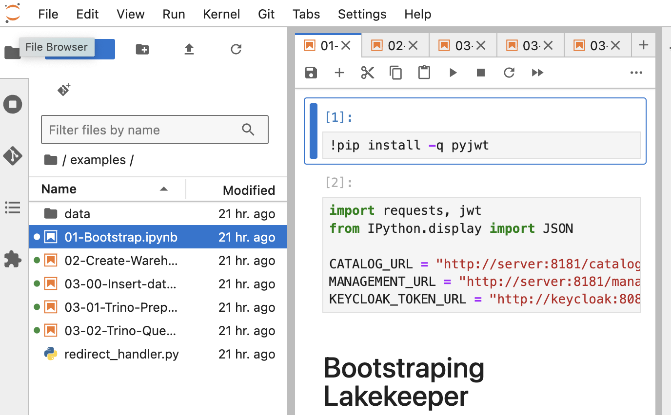 Open and run notebook *03-01-Trino-Preparation.ipynb. This notebook will install trino, connect to trino as human user and test connection. Also, it creates a Lakekeeper catalog reference. While running the notebook cell, a login prompt will appear. Login as user peter. Remember that, user peter is the admin user in lakekeeper, therefore, he will be able to execute queries from this notebook.