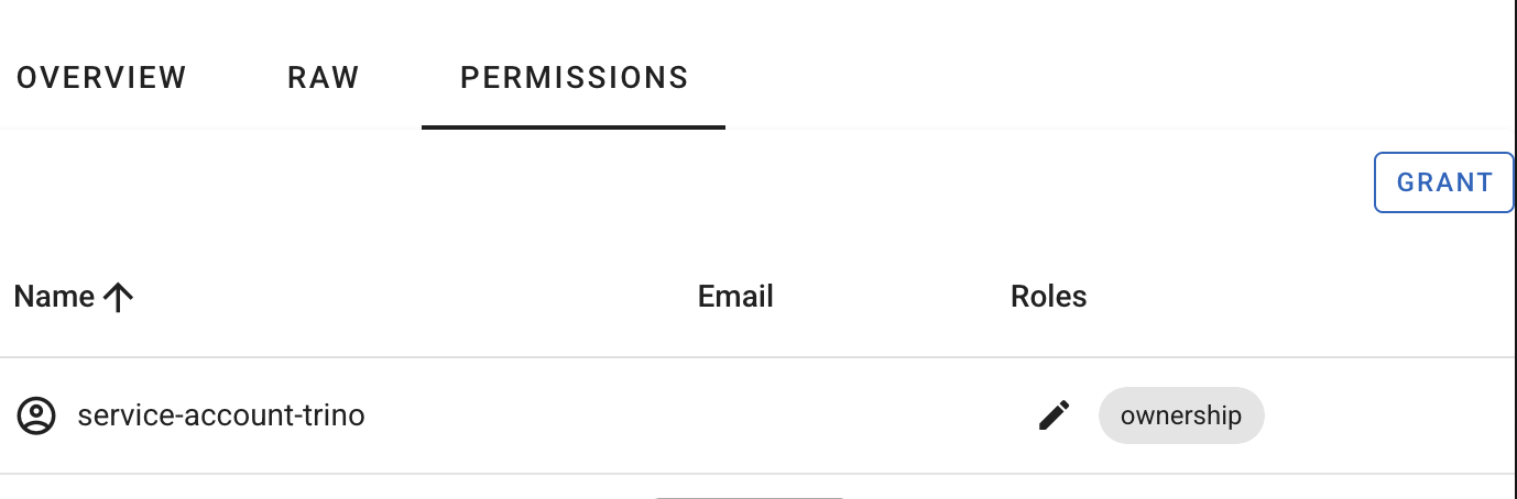- Select PERMISSIONS from the tab menu and click GRANT from the far right.
