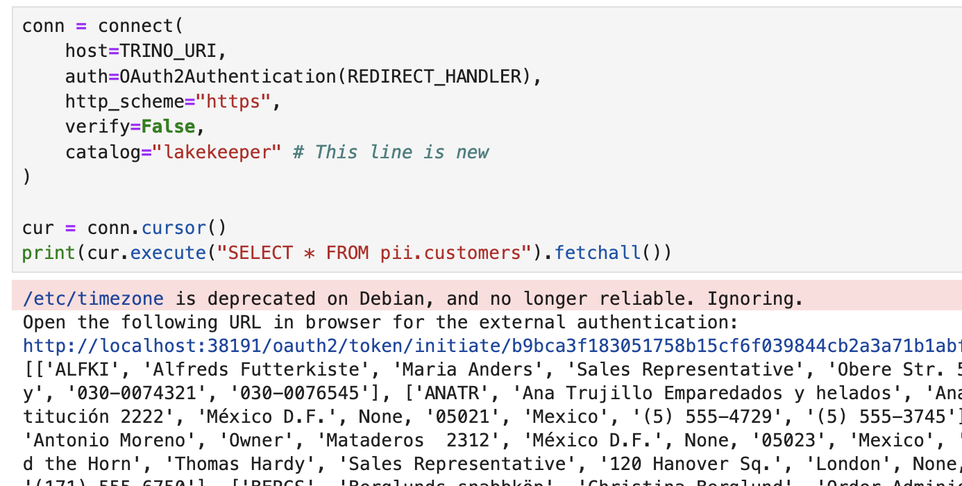 - Now, go back to the notebook and read data from Customers table as user Anna. This time, trino will be able to fetch data.